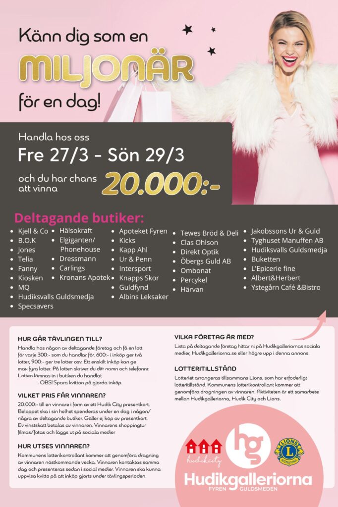 Lotteriet arrangeras tillsammans Lions, som har erfoderligt lotteritillstånd. Kommunens lotterikontrollant kommer att genomföra dragningen av vinnaren. Aktiviteten är ett samarbete mellan Hudikgalleriorna, Hudik City och Lions.✨